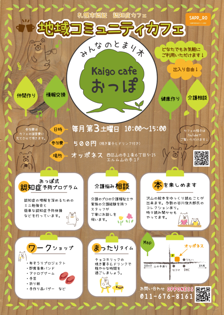 札幌市の認知症カフェの認証を受けています。(オレンジカフェ)常時認知症サポーターがいますので、認知症ご本人やご家族の方もお気軽にご利用ください。