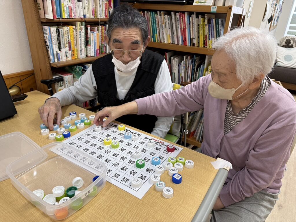 こちらもおなじみ漢字パズルで巧緻訓練。ご夫婦で仲良くくつろぎながら取り組まれています。