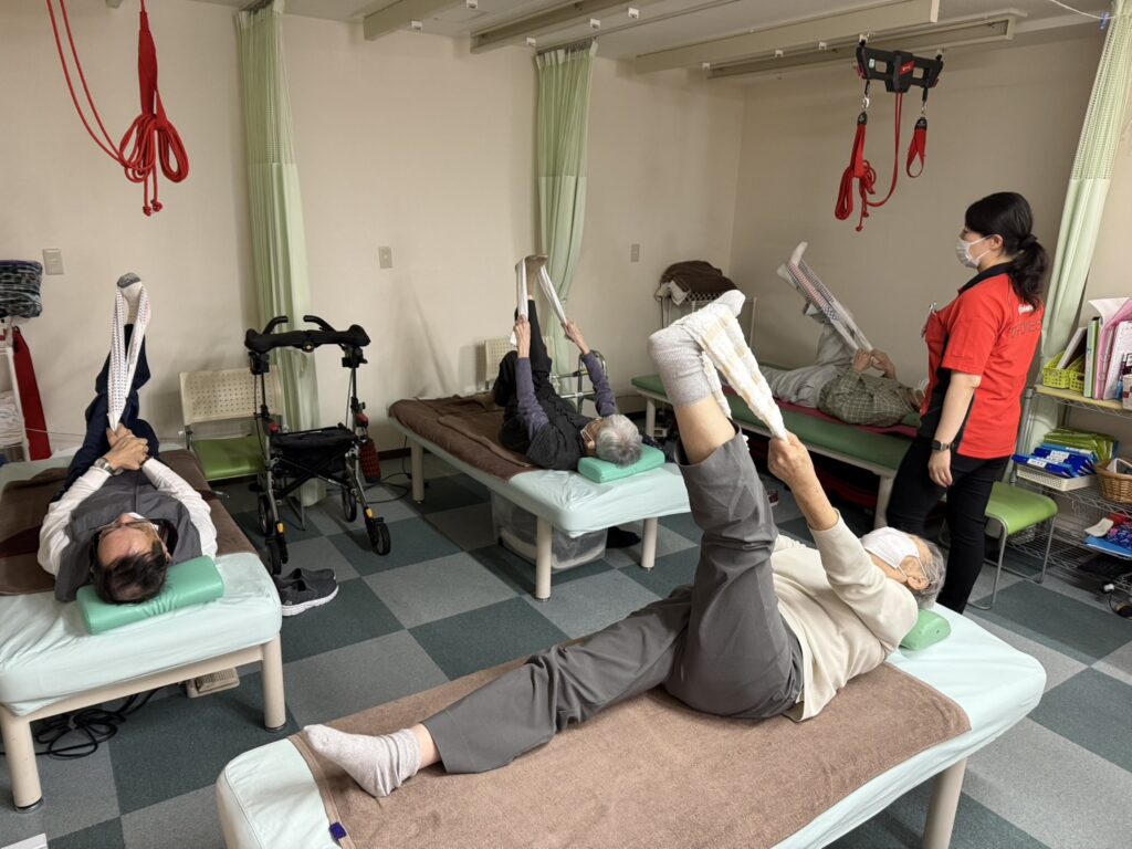 くつろぐといえばセルフストレッチも心地いいですね。寝たままタオルを使った腿裏伸ばしは、反り腰の予防にもつながります。中にはくつろいでストレッチの途中心地よくて眠ってしまう方も・・・