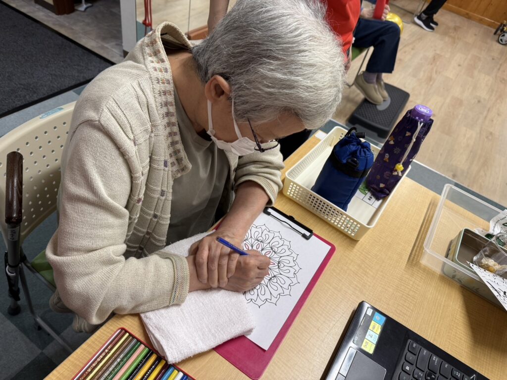 こちらでは塗り絵に取り組まれています。今年も11月は「山の手文化展」を開催いたします。ご利用者様や地域の皆様の趣味活動を展示させていただきます。来月末より作品を募集いたしますので、ぜひご参加くださいね!