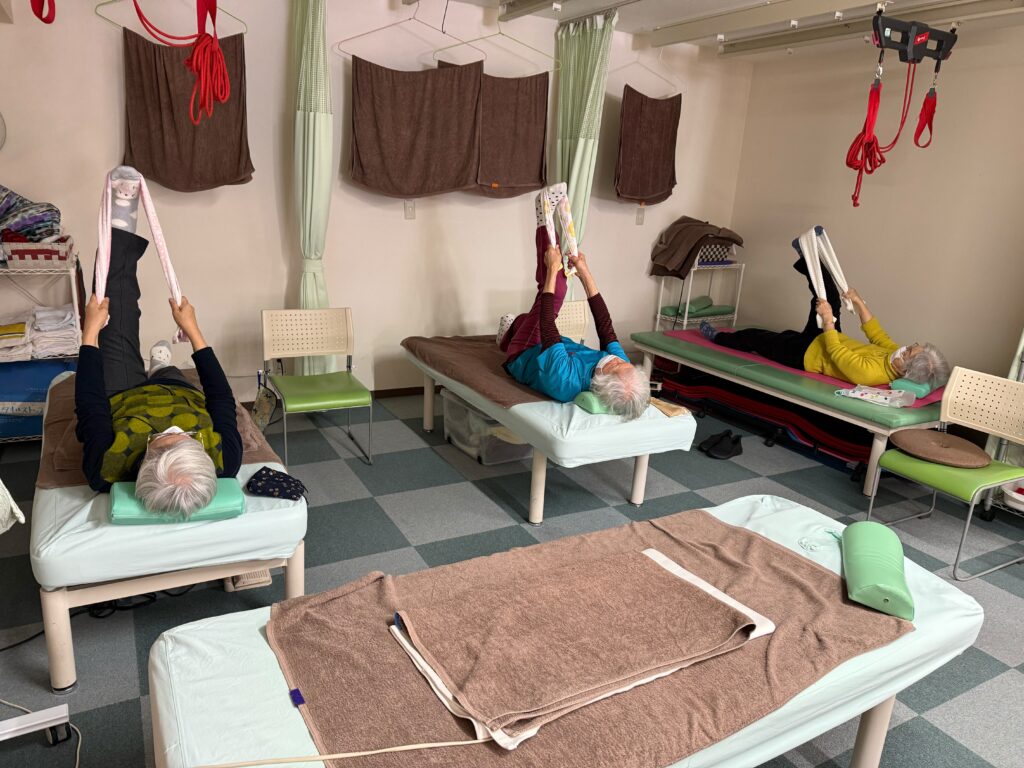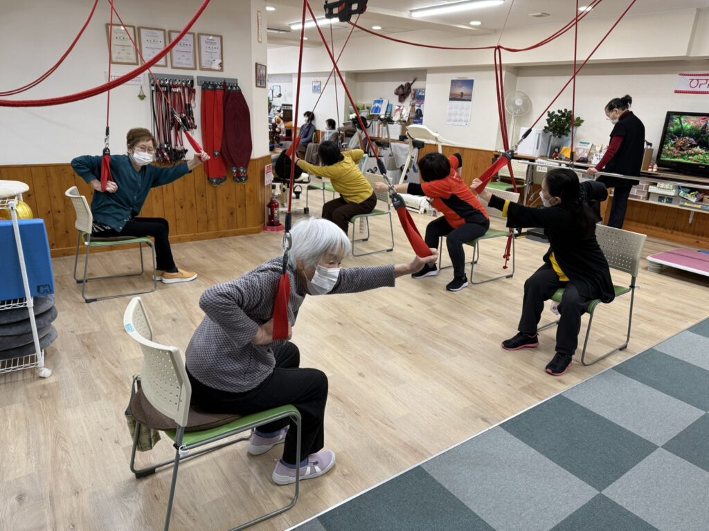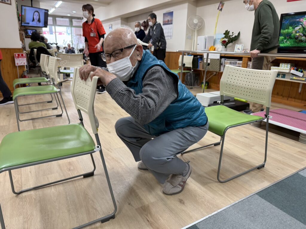 こちらはアヒル隊の親分・・・ではなく、おっぽらっく山の手最高齢99歳のご利用者様によるフルスクワットです!メニューの合間も運動を欠かせません!!