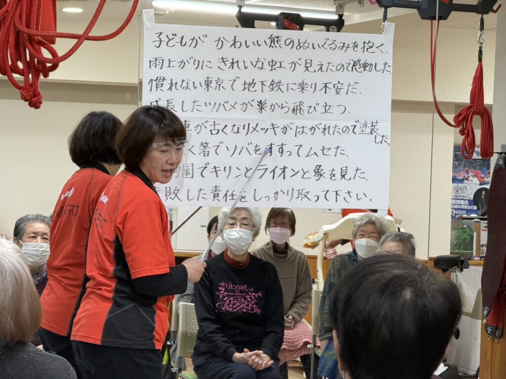 今週の口腔体操では「5語文音読課題」に挑戦。5語文とは5つの言葉を使った文を、音読することで発音や発話の機能維持向上・認知機能の維持を目的とした訓練です。特に高齢者には脳トレとしても活用できます。普段の何気ない会話も言葉数が少なくなってきますが、このように意識してみると日本語は面白いですし、使い慣れた言葉で十分訓練になりますね。
