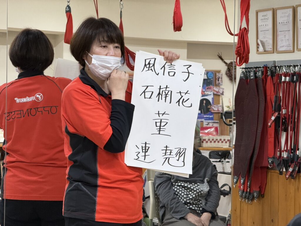口腔体操では難読漢字に挑戦。ヒントは花の名前。みなさん全部読めますか?