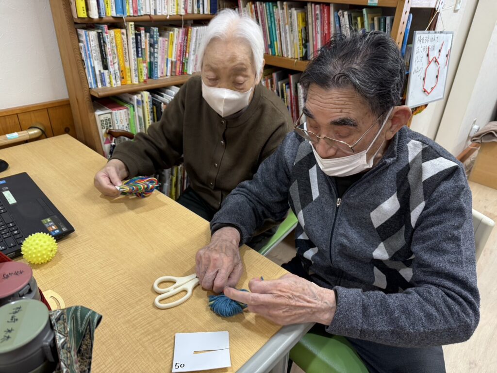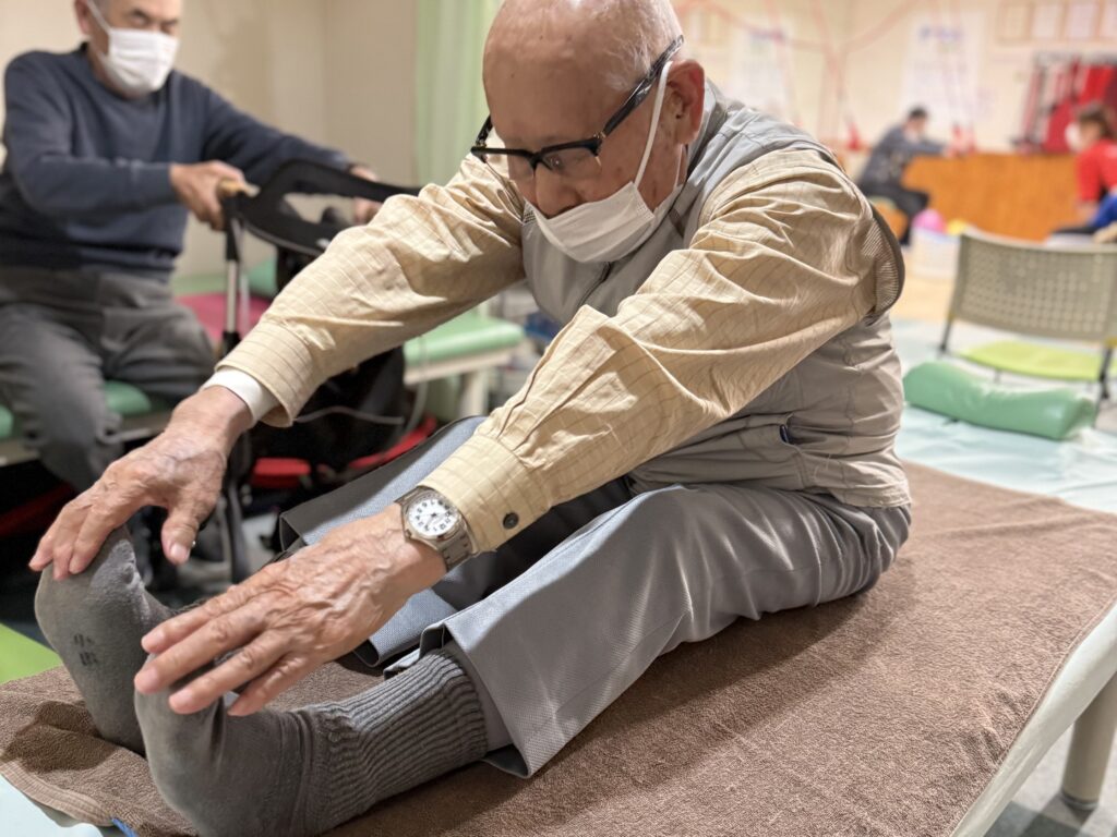 どうですかこの柔軟力!来週99歳を迎えるご利用者様。三角山に10000万回も登ったレジェンドでもあります。他のご利用者様の目標としていつまでも元気に通ってくださいね!