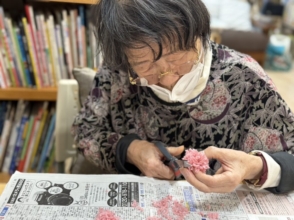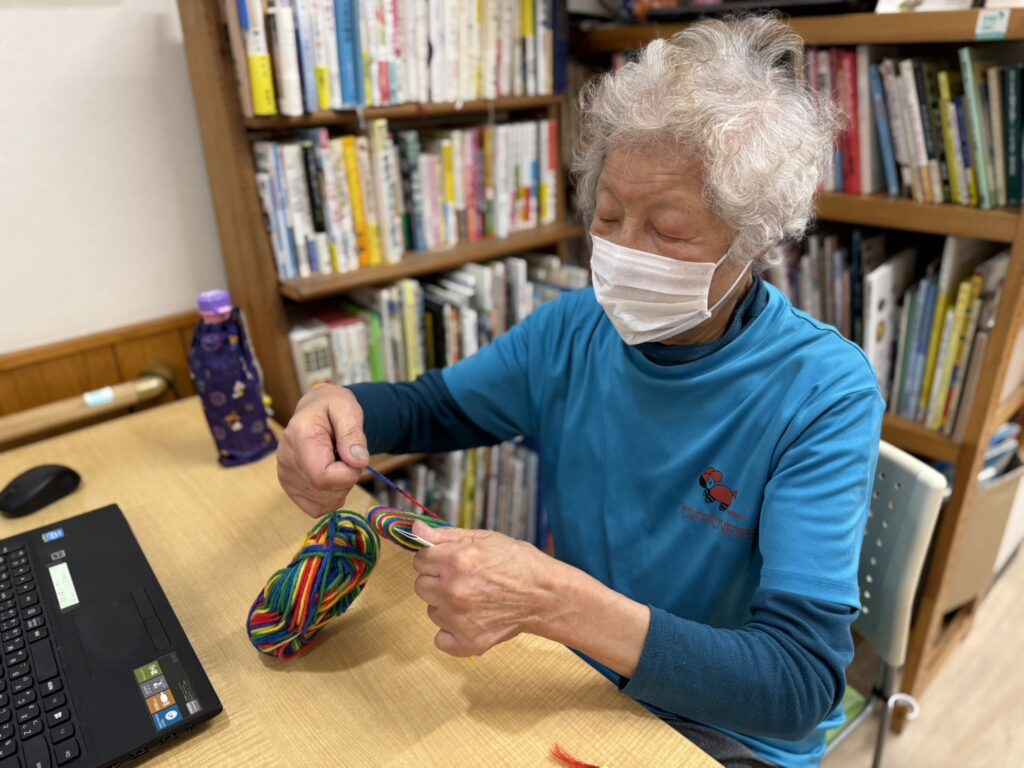 結んだ毛糸の先を切り、形を整えていきます。さて何が出来上がるのでしょうか?お楽しみに!
