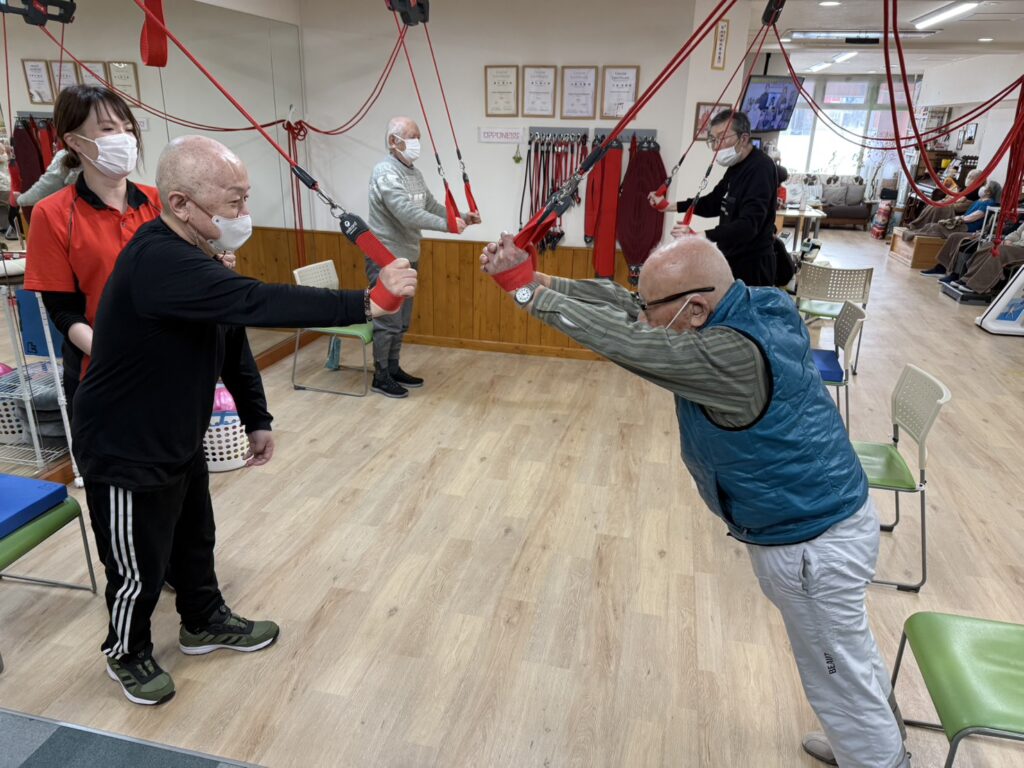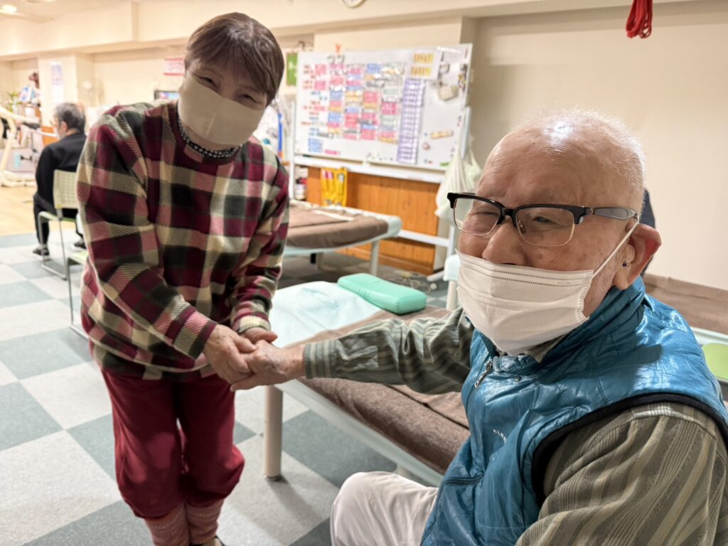 外は吹雪でしたが、中ではみなさん元気に運動しています。御年99歳のレジェンドご利用者様。一番お元気です!