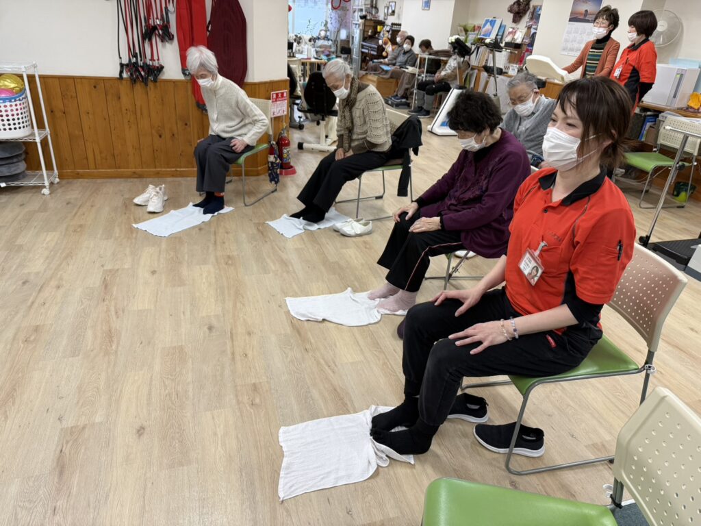 いつまでも元気でいるためにも運動は欠かせません!タオルギャザーで足をしっかり使いましょう。