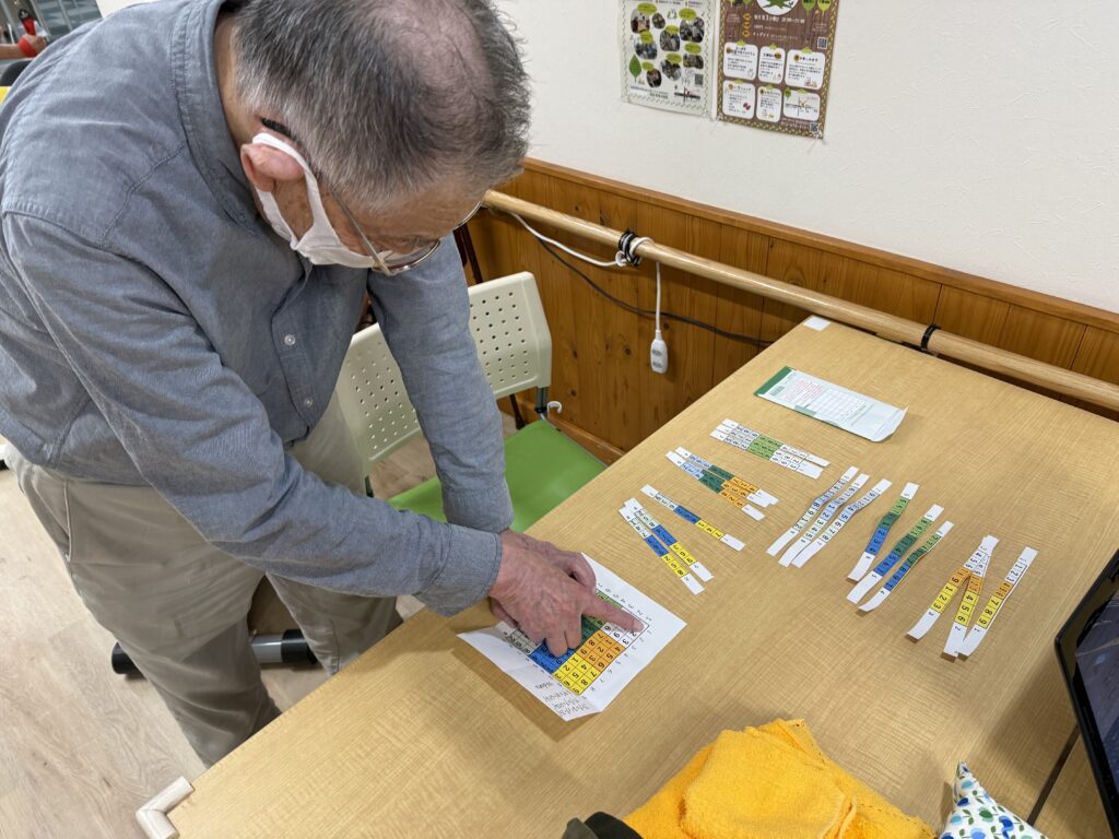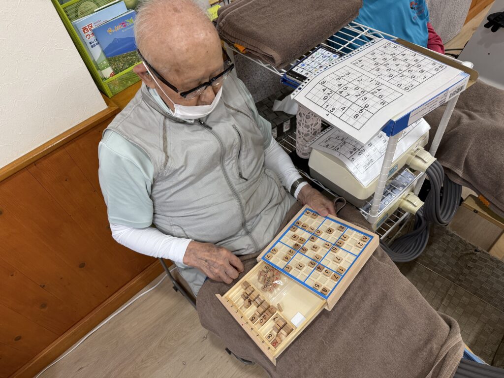 まもなく99歳を迎えるご利用者様。認知症予防に毎日ナンクロ(ナンバークロスワードパズル)に取り組まれています!普段スマホでやっているナンクロを今回は巧緻訓練を兼ねた木製ナンクロパズルで挑戦。さすがは毎日やっているだけあって次々にマスが埋まっていきます。