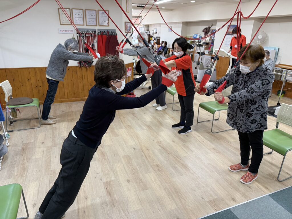 こちらは平行棒を使ったリズムダンスに挑戦!さすが昔社交ダンスやフラダンスをやっていたご利用者様。リズム感が素晴らしいです。カラダが勝手に動き出しますね!!
