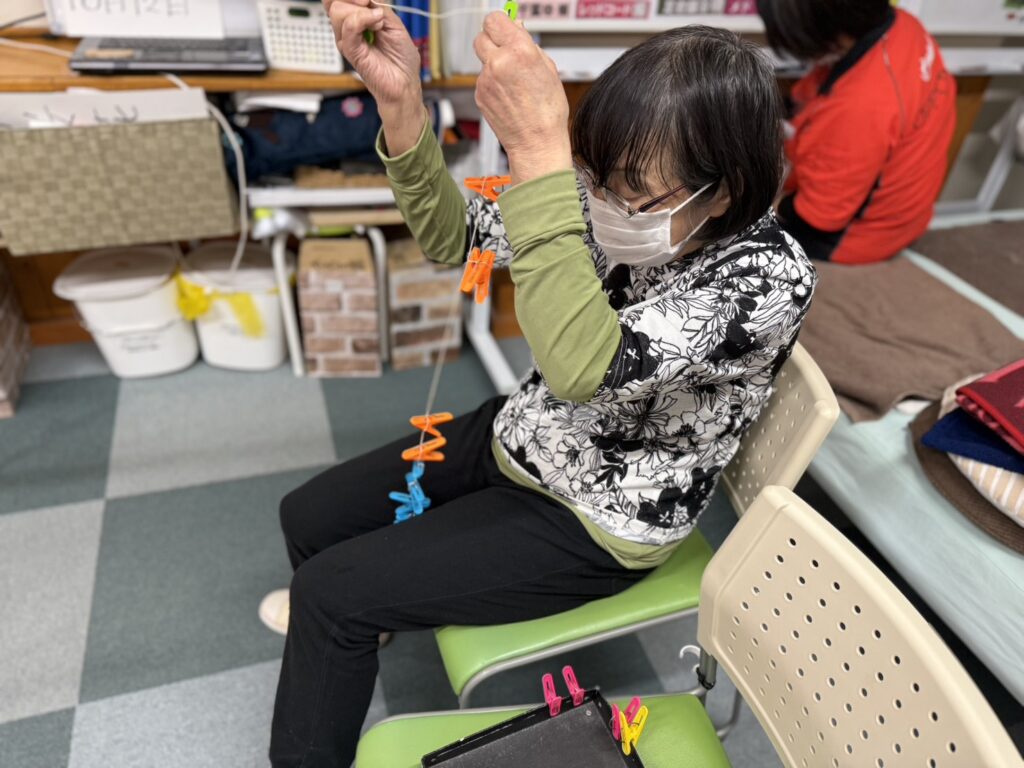 コチラは洗濯ばさみを使って巧緻訓練に取り組まれています。使いにくい左手で糸を通していきます。