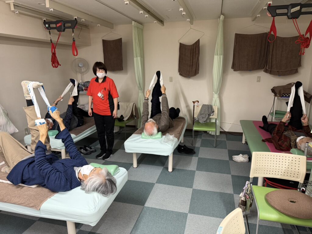 輪っかにした手ぬぐいを頭からかぶり足元から抜くエクササイズは、更衣訓練にもなりますが、何より全身を使わざる負えないいい運動です!
