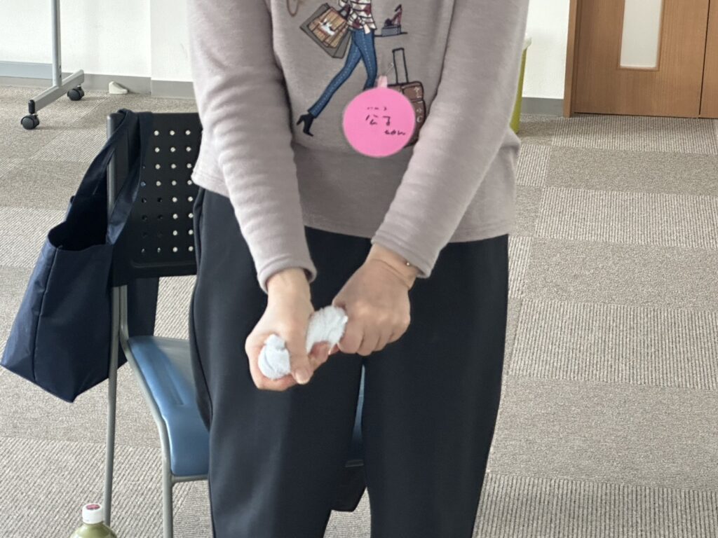 20日(木)は、山の手会館で一年健康教室を開催しました。一年教室でも手ぬぐいを使った運動をご紹介。身近にある道具を使うことで、運動のサポートになります。